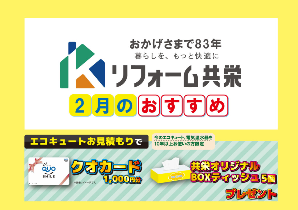 今のエコキュート、電気温水器を10年以上お使いの方限定の方 エコキュートお見積もりで… クオカード1,000円分 + 共栄オリジナルBOXティッシュ5箱 プレゼント 期間:2月1日(木)〜2月29日(木)まで […]