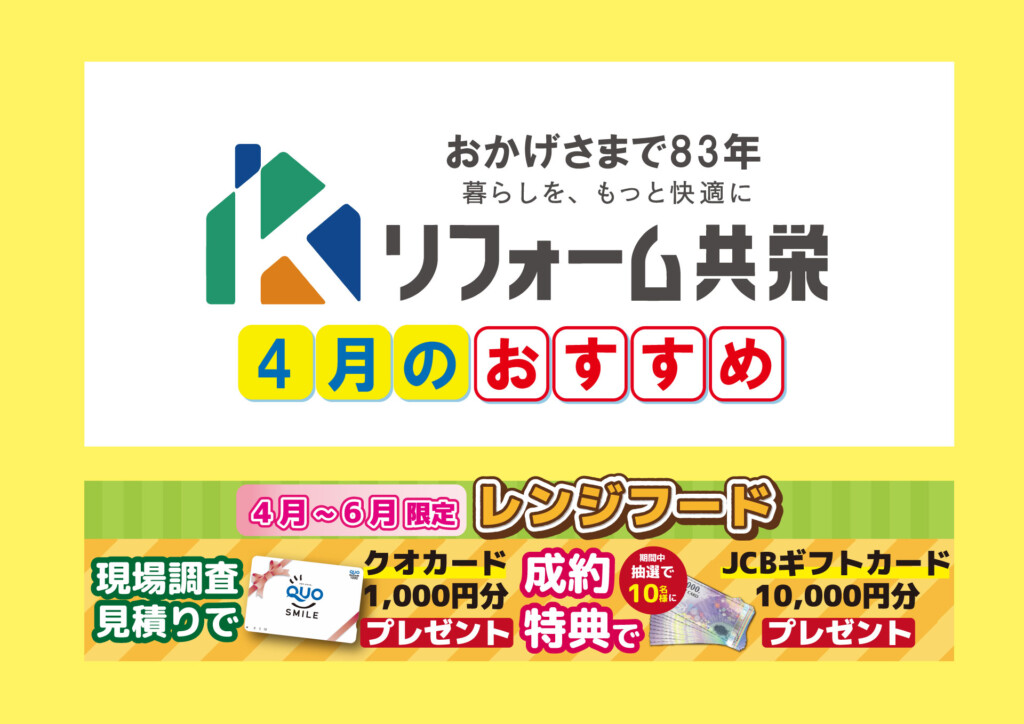 4月~6月限定 レンジフードキャンペーン 現場調査見積もりでクオカード1,000円分プレゼント!!成約特典で期間中抽選で10名様にJCBギフトカード10,000円分プレゼント!! チラシ掲載商品以外のレンジフード […]